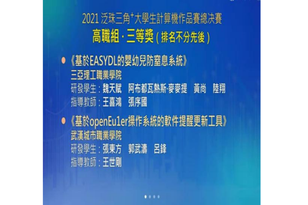 2022??7日,2021泛珠三角⁺大学生计算机作品赛总决赛在澳门理工大学落下帷幕,本次大赛共有全?00多所高校参赛,经过省赛筛选,共有40余组参赛作品入围全国总决赛。经过激烈角逐,我院阿布都瓦热斯·麦麦提、魏天赋与其他学院两位同学,联合组队参赛的作?基于EasyDL的婴幼儿车内防窒息系统,最终脱颖而出,喜获总决赛全国三等奖、/span>