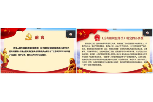 学院教工党支部集中组织安排学习习近平法治思想、习近平关于做好《中华人民共和国反有组织犯罪法》普法宣传的重要指示精神。学生党支部线下、线上组织召开专题班会进行反电信网络诈骗犯罪法制教育宣传、/span>