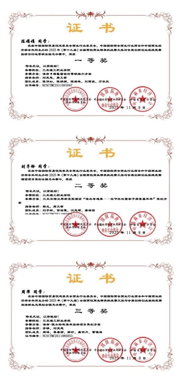 师生的共同成长,是“以赛促学”的最佳闭环。在教师课程设计赛中,由周文哲、刘笑慈、杨戈、胡庭恺四位老师组成的教学团队,凭借其前沿性与实战性并存的作品《旅游短视频营销》与《导游英语口语》,双双斩获一等奖。他们的课程设计,直接源于指导竞赛和行业实践的总结提炼,将赛场上的真实案例、行业的最新动态转化为课堂教学的鲜活素材,确保了学生所学即为市场所需。
